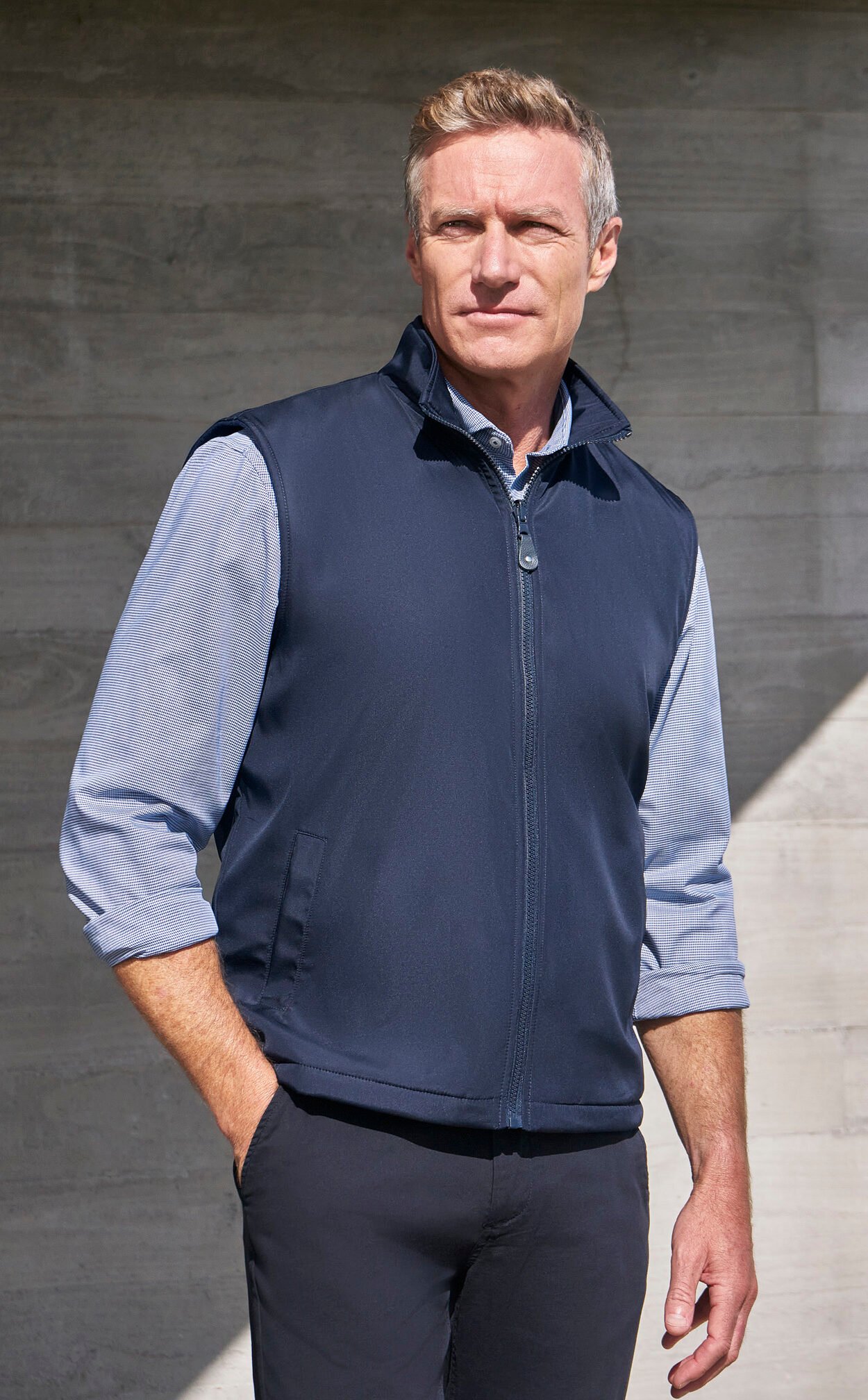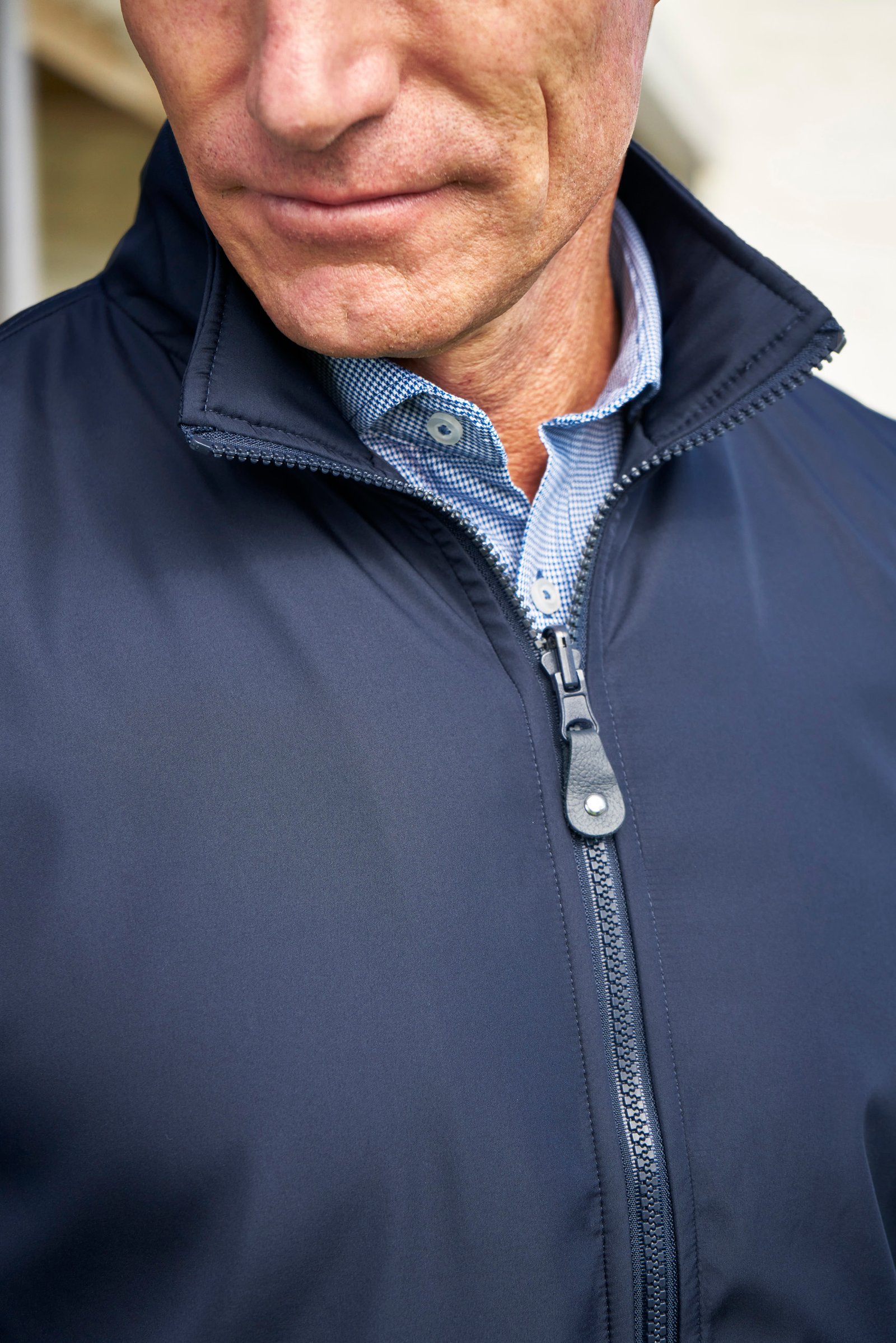 – Full front zipper with leather puller