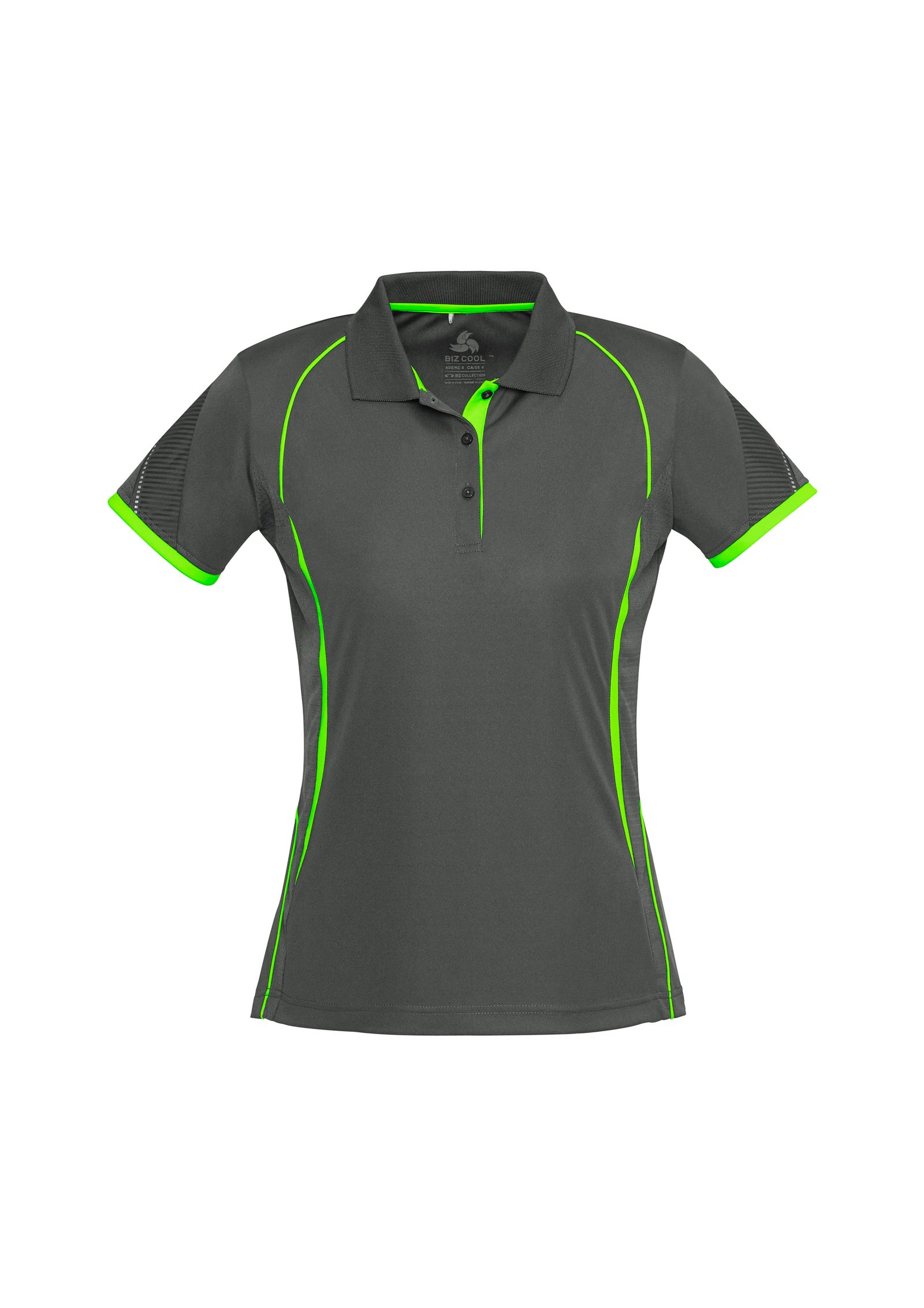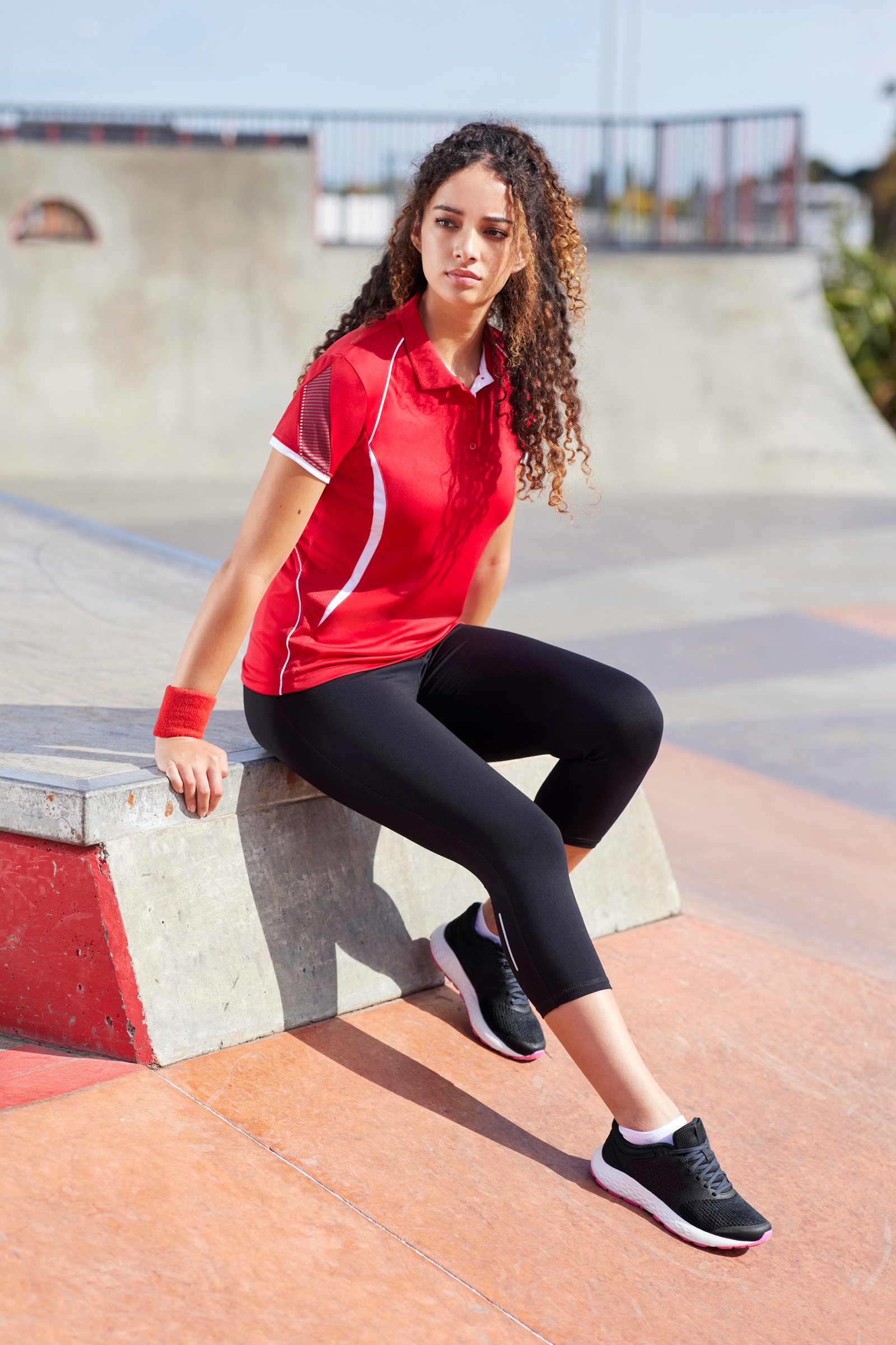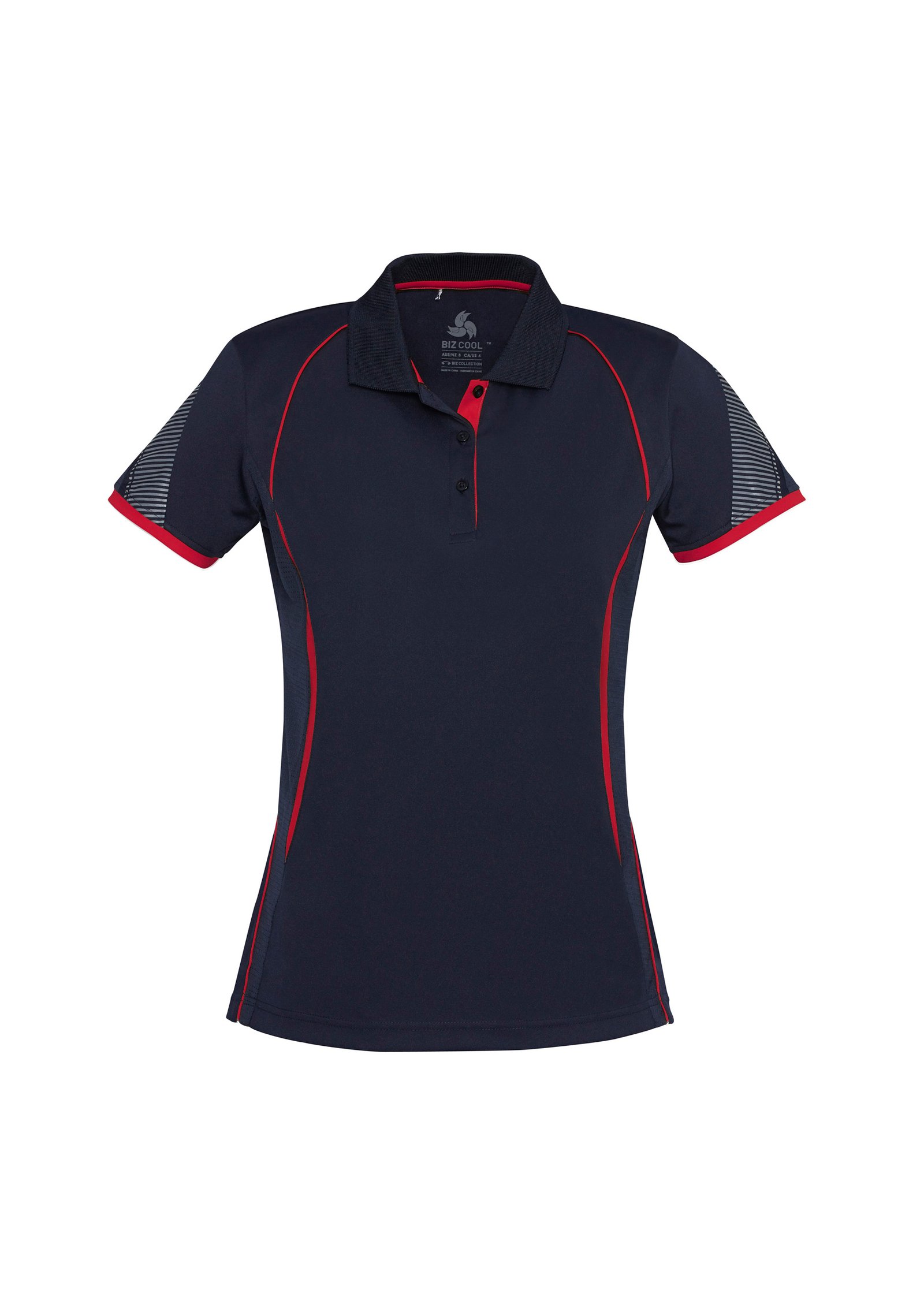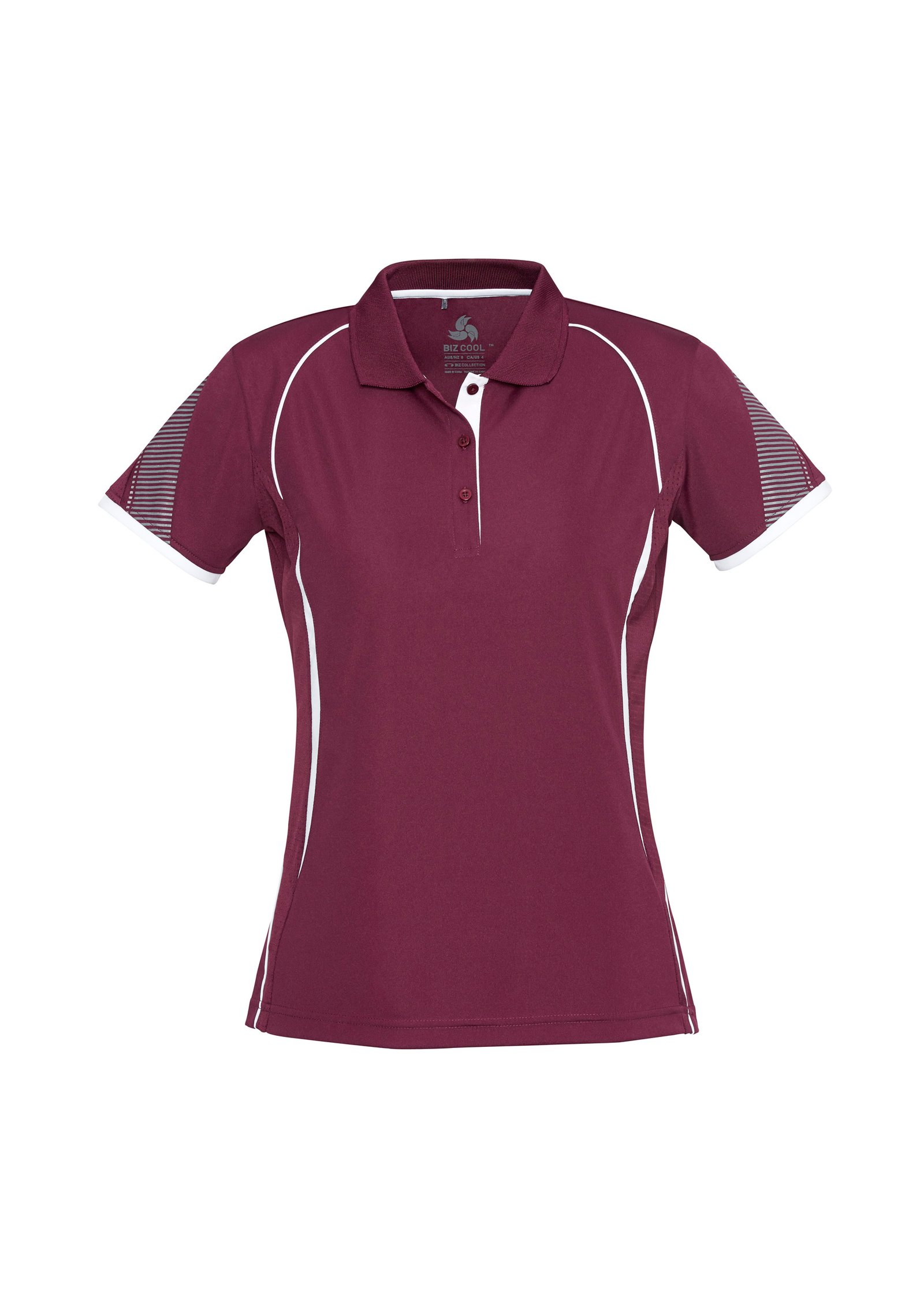 Sizes 8 – 24 Fabric – 100% BIZ COOL™ Polyester Sports Interlock – 155 GSM – UPF 50+ Features – Grid mesh underarm panels for breathability – Unique sleeve print feature – Contrast panels and piping – Knitted collar with contrast placket